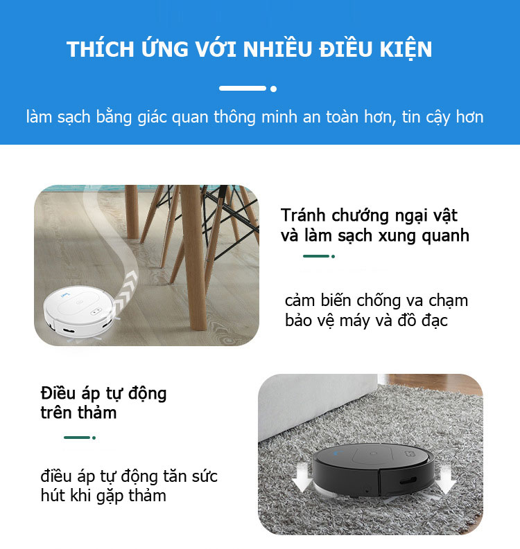 Robot có thể hút bụi và lau ở nhiều bề mặt khác nhau như sàn gạch, sàn gỗ hoặc thảm. Thiết bị có khả năng tự động phát hiện thảm, tự điều chỉnh lực hút tăng cường để làm sạch và không lau ướt trên thảm. Bên cạnh đó, robot còn sở hữu cảm biến độ cao phát hiện bậc thang để dừng và quay lại kịp thời, hạn chế tình trạng rơi vỡ gây hỏng hóc.